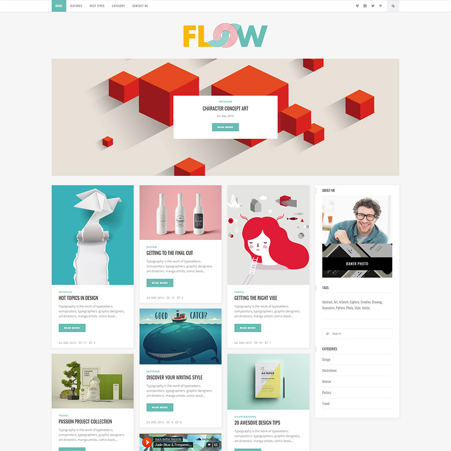 Let your writing flow free with Flow, creative blog theme. Its lively design, limitless features and premium plugins included for free will surely make you wanna go with the Flow all the time.