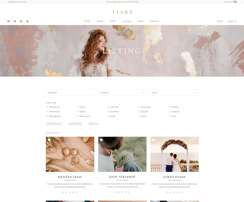 Welcome to Tiare, a beautiful theme for modern wedding vendor directory websites packed with all the captivating layouts and features your wedding listing site can ever need. Celebrate love, get Tiare this very day!